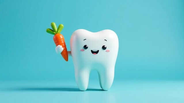 A cartoon tooth is holding a carrot on a blue background. Concept of healthy eating for strong teeth. Concept of dental care.