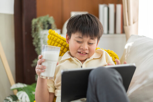 Asian boy holding a glass of milk drinking while playing game on tablet or watching cartoons at home, promoting healthy habits childhood fun activity screen time and nutrition educational concept