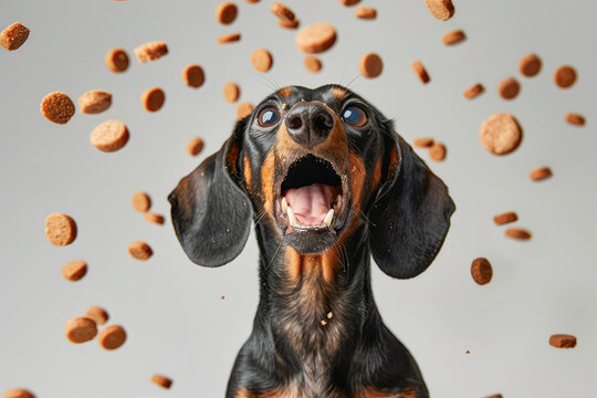 A dachsund catching a dry dog treat mid-air in a studio, showcasing the tasty and natural rewards for pets