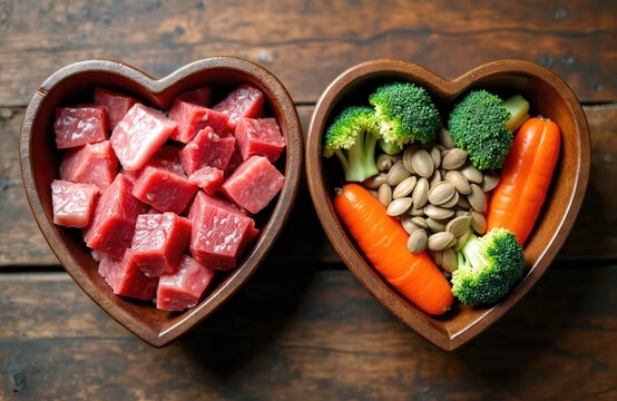 Two heart shaped wooden bowls filled with raw beef cubes and fresh vegetables like broccoli carrots and seeds. Natural healthy ingredients for pets displayed on rustic wood surface.