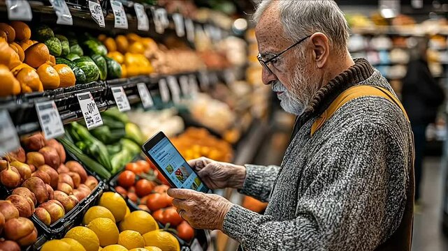 a handsome elderly man grocery shopping in a modern supermarket using a tablet