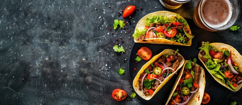 Beef tacos served with salad, tomato, and beer. Blank space. Top view.