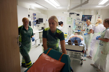 Female doctors and nurses doing treatment on male patient in operating room at hospital