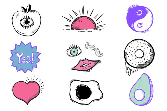 Psychedelic stickers, retro hippie pattern with flowers, hearts, sun, moon and stars. Vector doodle illustration with signs of peace, yin yang, funny and weird icons of butterfly, eyes and hands