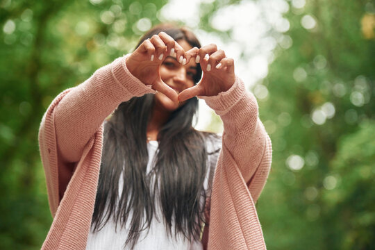Showing heart gesture by hands. Cheerful beautiful woman is standing outdoors, green leaves at background