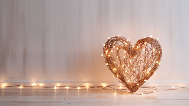 Elecric garland in the shape of a heart on a wooden background with copy space.