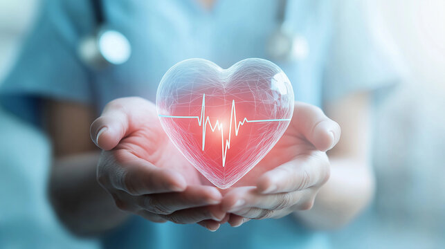 A doctor holding a red heart with an electrocardiogram line displayed on it.