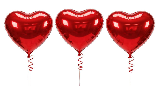 Set of Air Balloons. Bunch of red color heart shaped foil balloons isolated on white background. Love. Holiday celebration. Valentine's Day party decoration. Metallic red  Heart air balloons