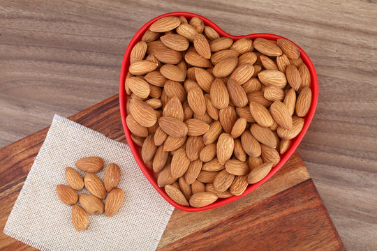 Heart shaped bowl of sweet dried plums on wooden background, top view. Healthy fruit
