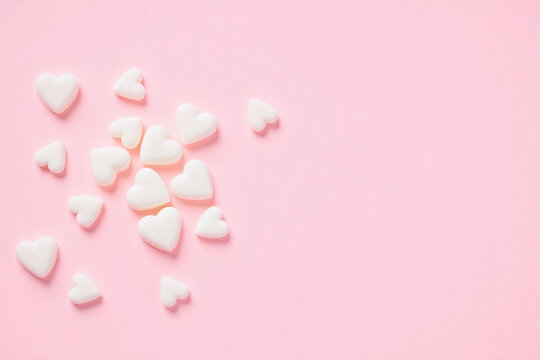Joy of gifting with sweets in a heart shape box. Colorful heart-shaped candy in a pink box on a pastel background.