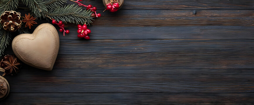 Warm and inviting rustic decor featuring a heart-shaped ornament, pine branches, and festive accents on a wooden background, perfect for holiday themes.