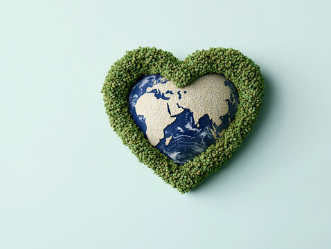 A heart-shaped globe symbolizes love for the Earth and global unity, perfect for environmental themes and sustainable ideas.