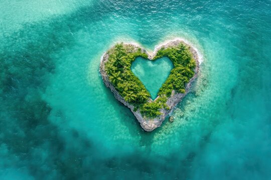 An overhead view of a heart-shaped island surrounded by turquoise water,