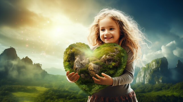 A happy girl embracing the world shaped like a heart with love, symbolizing love for the planet and environmental awareness. Eco friendly, Love for the world. Environmental