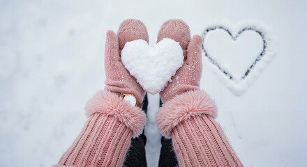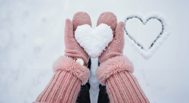 Woman holding snow heart with pink mittens on snowy background