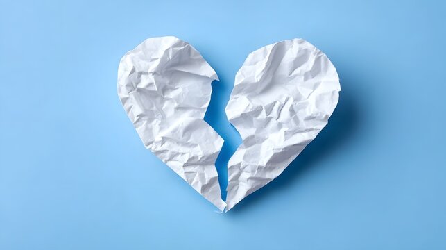 A crumpled white paper heart broken into two pieces lies on a light blue background representing heartbreak loss and emotional distress in relationships