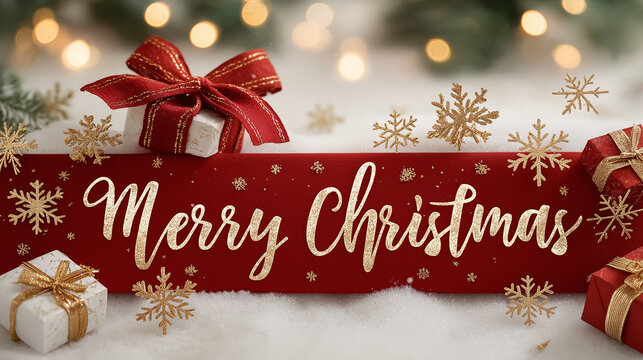 Christmas Cheer: A festive Christmas scene features elegant gifts and ornate golden snowflakes with Merry Christmas banner. A heartening display of seasonal joy and celebration.