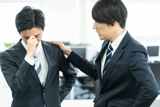 Businessmen encourage : Businessman smashing shoulders encouraging colleagues : Close up of male business man comforting colleagues with worries.