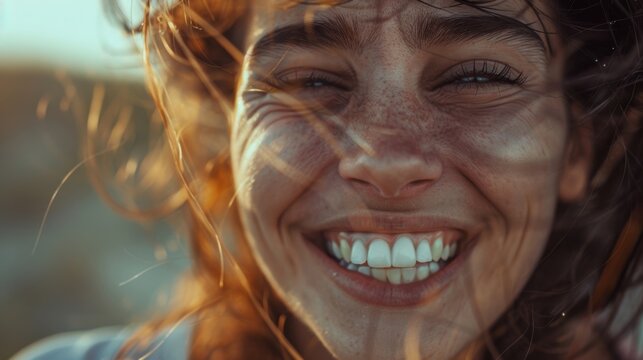 Person smiling warmly. A close-up moment capturing genuine happiness with eyes crinkling during a heartfelt smile.