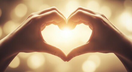 Heart shape made with hands against a golden bokeh background expresses love and care. Heart shape signifies heartfelt connection, showing warmth, affection, and compassion.