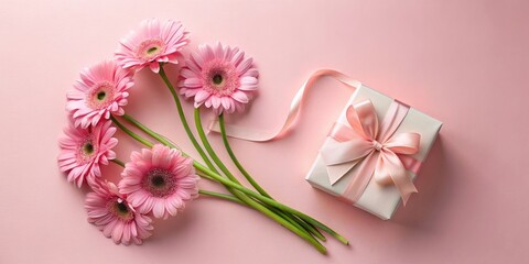 Pink gerbera daisies and a delicately wrapped gift create a lovely springtime scene, perfect for celebrating a special occasion or conveying heartfelt sentiments.