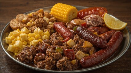 A plate of hearty meat and potato dishes with corn on the cob, lemon wedge, and various cooked meats.