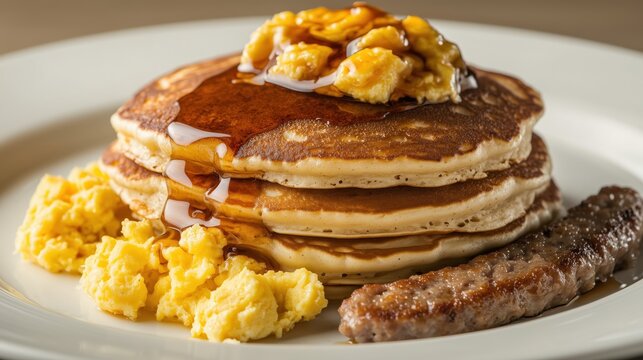 Golden pancakes layered with syrup shine under soft lighting, complemented by creamy scrambled eggs and a savory sausage patty for a hearty breakfast scene.