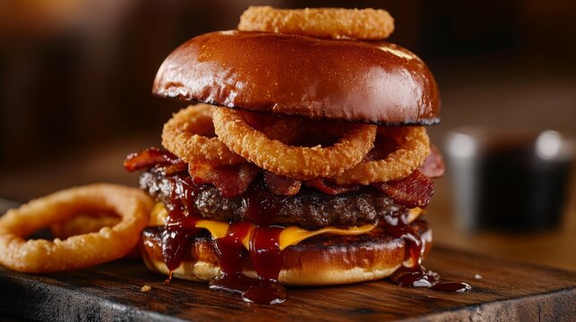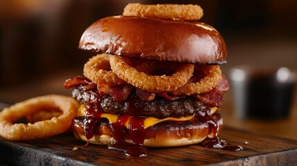 A hearty burger featuring a beef patty, melted cheese, crispy bacon, and onion rings, drizzled with barbecue sauce on a wooden surface.