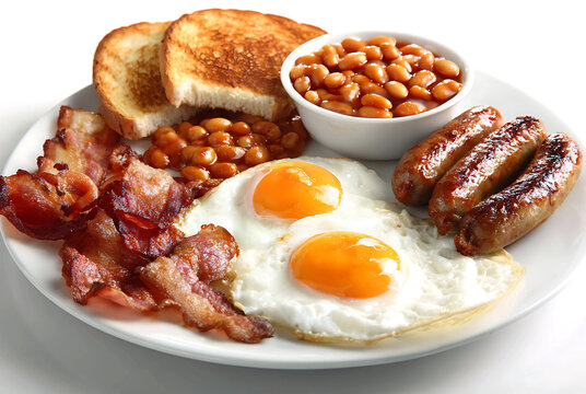 A hearty breakfast plate features eggs, bacon, sausage, beans, and toast