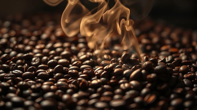 Steam rising above dark roasted coffee beans creating mesmerizing blend of aroma and warmth, visual sensation of heat, image, heat