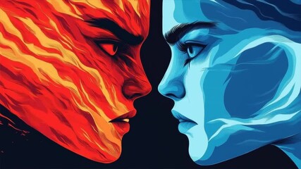A striking contrast of heat and cold, symbolizing the duality of human emotions through fiery and icy visuals.