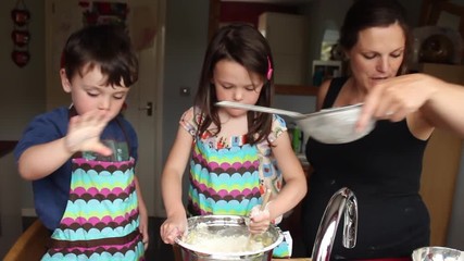 Young family baking a cake in kitchen. Mum is heavily pregnant and teacher her son and daughter how to bake a cake on maternity leave