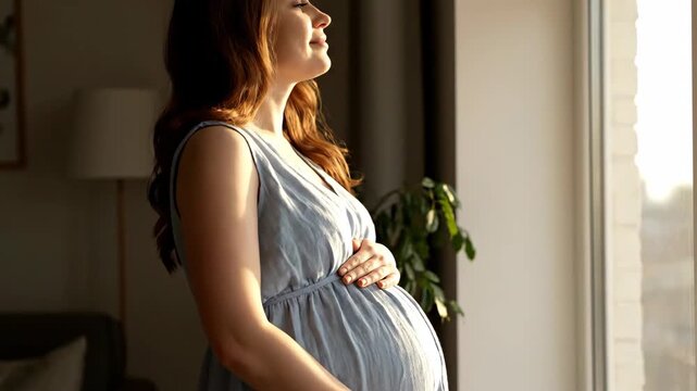 heavily pregnant, Peaceful Pregnant Woman Embracing Her Baby Bump by a Sunlit Window.
