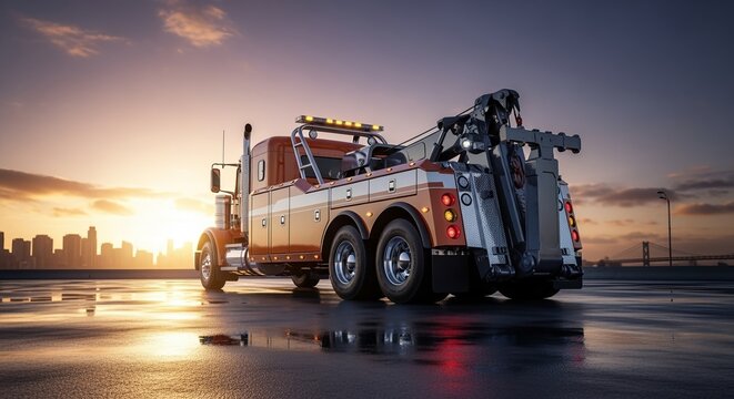 Orange Tow Truck on Wet Pavement at Sunset Skyline
