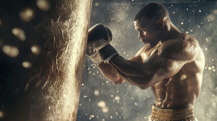A heavyweight boxer landing a punch on a punching bag, with the impact causing ripples through the bag and dust flying off, symbolizing strength.