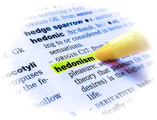 A close up of the word: HEDONISM in a dictionary, highlighted in yellow and showing part of its definition.