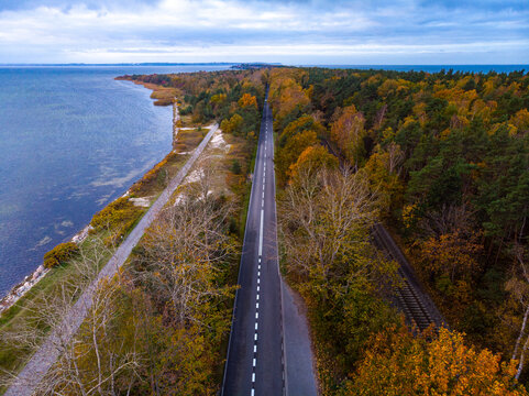 aerial photo of colourful trees on the hel peninsula at sunset; colourful autumn leaves by the sea; Baltic sea in autumn