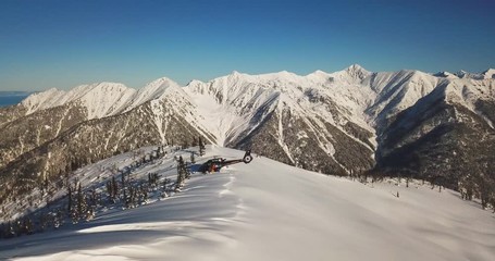 Actionsportlers were dropped by a helicopter at the top of the mountains. The sun is shining brightly in the blue sky. There is a mountain range in the background covered in snow. Drone shooting.