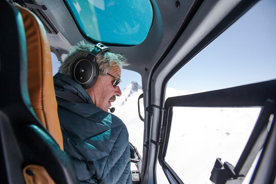 Helicopter pilot looks for a place to land in snow covered mounatins.