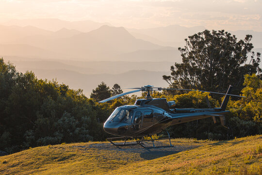 helicopter at sunset with mountains in background