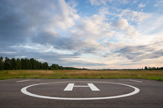 A closeup of an asphalt-covered helipad with a special symbol in the center for helicopter landing, against the backdrop of a green field and a cloudy evening sky.