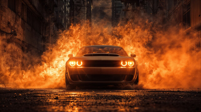 A car engulfed in fiery smoke burns on a city street at night