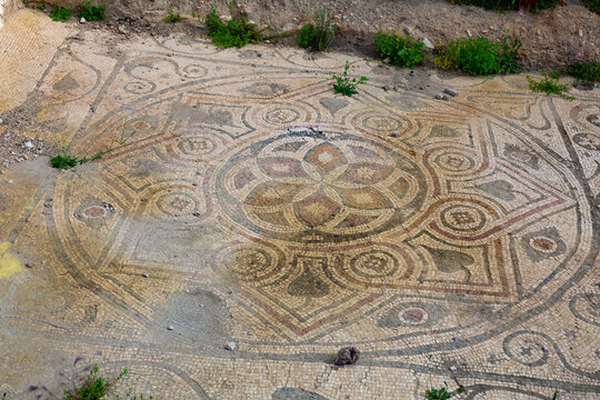 Remains of old colored mosaics on floor of ruined building in Turkish city of Arykanda. Art of ancient civilizations. Historical archaeological sites in Antalya province