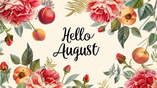 Hello August Greeting – Floral Decorative Design with Summer Flowers