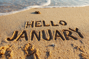 Surfboards on sandy beach at sunset with 'hello june' text overlay