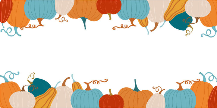 Background with leaves of maple, chestnut, oak and berries in the fall. Hello autumn seamless banner with orange and red leaves. Vector illustration with seasonal foliage decorations and copy space
