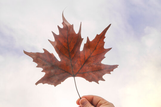 Hand holding red autumn leaf close up. brown red Maple fall leaves in park. Hello october concept. Nature change mood. Yellow sunny forest on orange color background. Pov view up blue sky. tree season