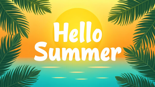 "Hello Summer" greeting on beach : A vibrant, sun-drenched scene, with palm leaves framing the text of Hello Summer over an idyllic ocean vista at sunset
