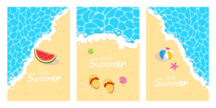 Hello summer text with beach, blue waves, umbrellas and swirls on a gradient blue background