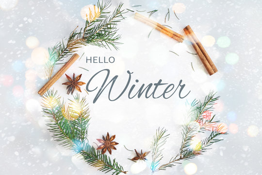 Hello Winter Card With Pine Branches And Decor Templates